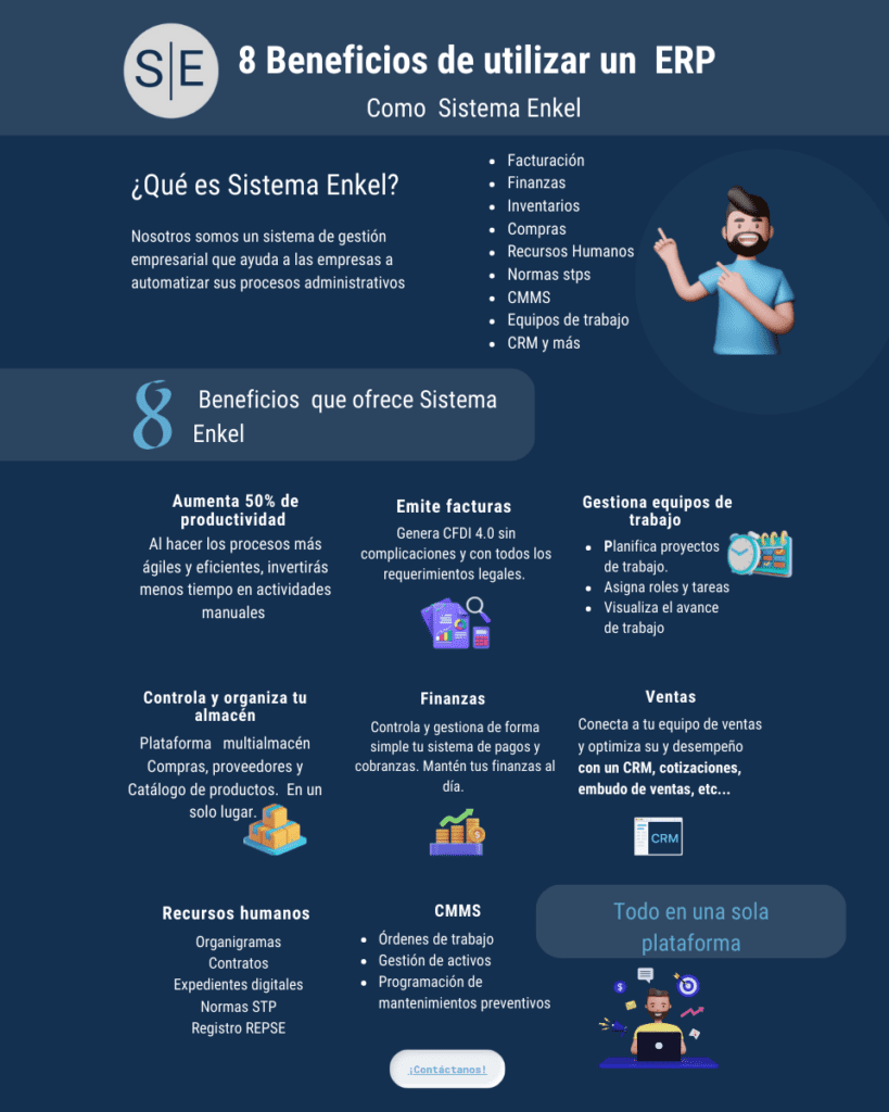 Usualmente, un sistema ERP con un software de recursos humanos integrado te ayudará a tener actualizada tu plantilla de trabajadores para que generes expedientes digitales, contratos de trabajo de forma, organigramas, reclutamiento, control de horarios y asistencia.